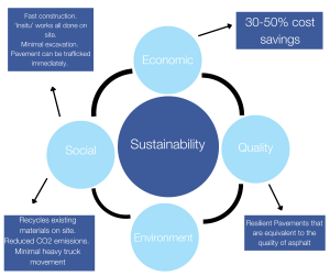 - Quality benefits: The end-result of this method gives clients a resilient pavement that has been designed to have the equivalent quality level of traditional asphalt roads and pavements.